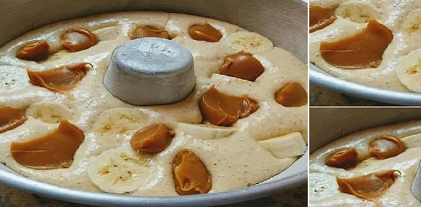 Precalentar el horno a 180 grados, poner en forma untada y enharinada, poner rodajas de plátano y pequeñas porciones de dulce de leche por encima. Ponga para asar más o menos unos 35 minutos. Haga la prueba del palillo.